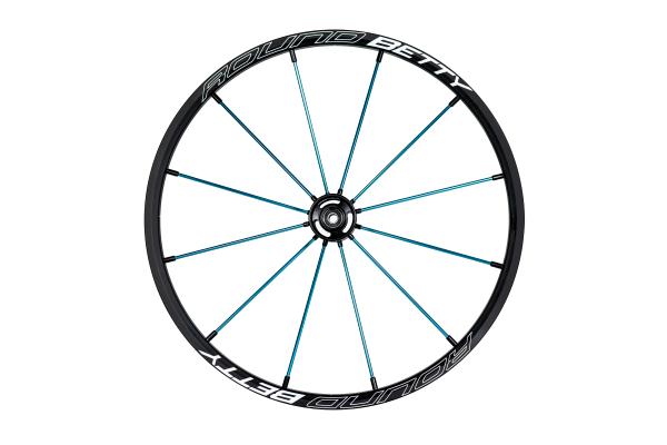 Throught the use of Round Betty's proprietary aluminum tubular spokes, the Dino has unmatched pushing characteristics. The tubular spokes are available in nine custom anodized colors. The low spoke count of the Dino custom wheelchair wheel allows easy access through the wheel as well as a feather light unit. Ideal for any ultralight wheelchair.
